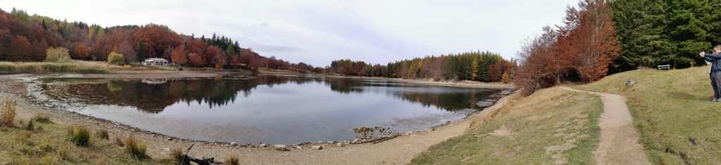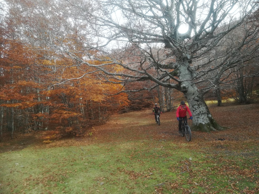 Per il sottoscritto l’autunno è la stagione migliore x praticare il nostro sport ; poca gente in giro e la magia delle piante che con i loro nuovi colori mutano il paesaggio. Detto questo l’escursione di oggi parte dal campeggio di Cervarezza a quota 1000 metri, la temperatura è di 8 gradi , cominciamo a pedalare alle ore 11,siamo solo in tre Claudio, Maurizio e Paolino. Pochi ma buoni, come piace a me! La lunga salita iniziale non ci fà percepire il freddo anche perchè il sole comincia a fare il suo dovere. Al rifugio Santa Maria Maddalena ci concediamo una pausa, coccolati da un tiepido sole.: gli occhi e il cuore godono davanti ad un panorama stupendo, Maurizio scatta foto ad ogni angolo compiacendosi per il risultato. Peccato non esserci portati dietro un salame e un po’ di pane osserva Paolino. L’orario e lo stomaco ci invitano a riprendere la pedalata in direzione Lago del Ventasso che raggiungiamo percorrendo il sentiero cai 663. Anche qui i colori del bosco sono stupendi ma guardando il lago ci accorgiamo che …si è ristretto tantissimo, le ninfee sono ormai all’asciutto , la situazione ci rattrista un po’. Giunti al rifugio ci spiegano che il livello delle acque è stato abbassato x consentire dei lavori alla briglia posta a valle del lago. Le parole del gestore e soprattutto il piatto di farro con spek e gorgonzola ci fanno ritrovare il sorriso… Lasciamo il lago sperando di ritrovarlo “in forma” nella prossima primavera. Un “giovane” sentiero con tanto di passerelle sulla sassaia ci riporta sulla forestale che abbiamo pedalato la mattina. Ora scendiamo sfruttando sentieri un po’ fatiscenti, ricoperti da tante foglie fino a raggiungere il borgo di Cà Manari. Da questo punto pedaliamo lungo il “nostro ” sentiero Ventasso Mtb che seguiamo fino a Cervarezza. ( Le tabelle che avevamo messo a dimora sono quasi tutte scomparse) Giunti in paese risaliamo su strada asfaltata perchè la giornata è diventata corta, il sole non c’è più da un po’,il colore dominante ora è il grigio.. Chiudiamo il giro alle ore 17, la temperatura è tornata a 8 gradi , abbiamo superato 1200 metri di dislivello percorrendo 27 chilometri. La distanza non è molta ma la soddisfazione è tanta per aver passato una bella giornata-