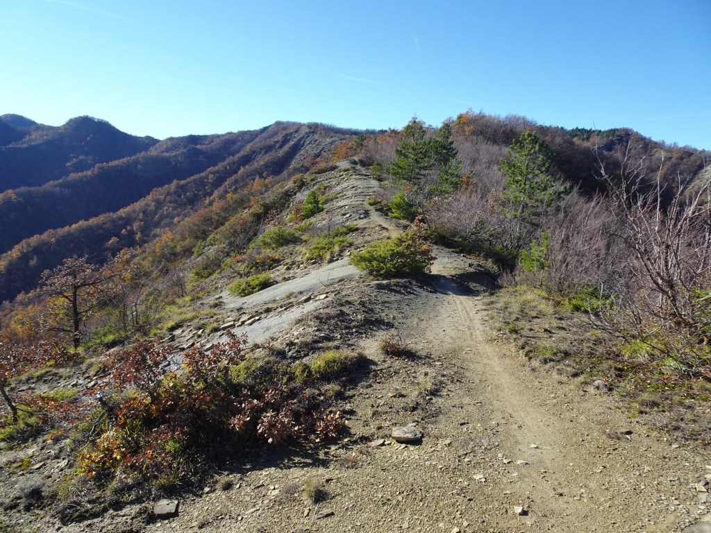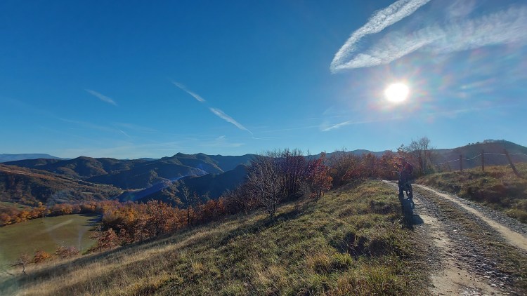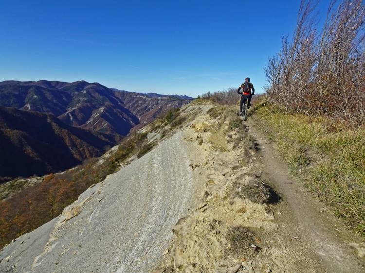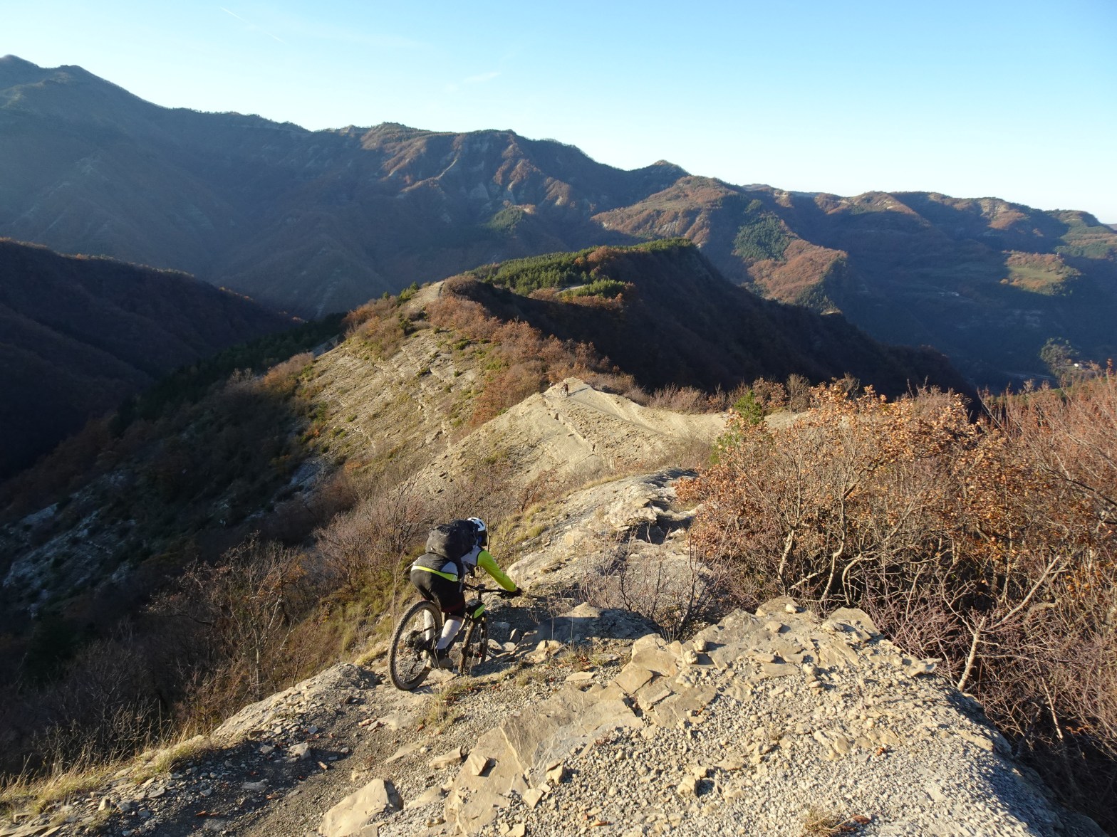 Giunti al Tiravento si torna leggermente indietro e si prende un sentierino in ripida discesa, molto umido, dove il controllo della mtb non è dei più agevoli ma, superato il primo pezzo, la pendenza si addolcisce e, una volta usciti dal bosco, inizia un tratto di crinale con brecciolino, piccoli salti, ed un panorama fantastico che ci fa apprezzare il fatto di essere in pieno sole rispetto alla vasta coltre di nebbia che si scorge in lontananza e si insinua nelle vallate.