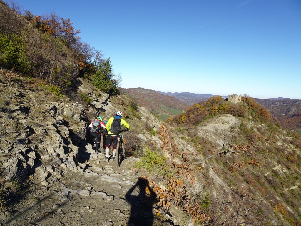 Per un buon tratto la discesa risulta essere alla mia portata poi, giunti nei pressi della Torre di Montalto, si fa più impegnativa e per un po’ rinuncio a restare in sella per non guastare la festa a me ed agli altri (ma in diversi passaggi non sono il solo).