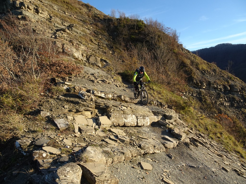 Giunti a valle si riprende la salita per il “doppio” Tiravento, dapprima su asfalto, poi carraia (con ‘sosta panino’ al sole ad una temperatura quasi primaverile), di nuovo asfalto e di nuovo carraia che poi cede il posto ad un sentiero ripido, con diversi dislivelli da superare, a tratti anche un po’ esposto, dove avrei fatto volentieri cambio con una bici “muscolare” dal peso ben più contenuto.