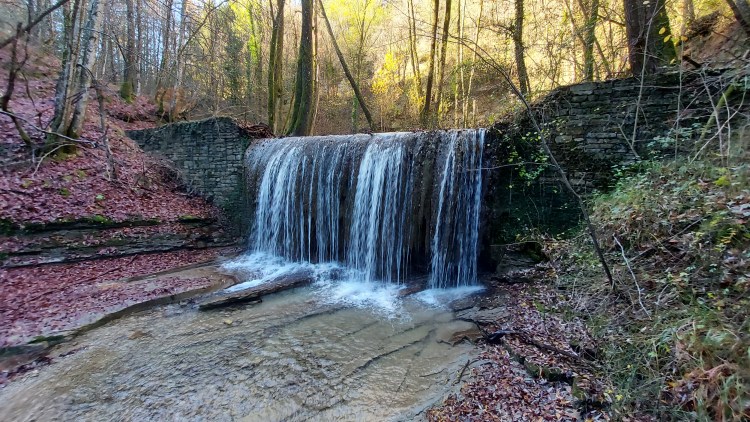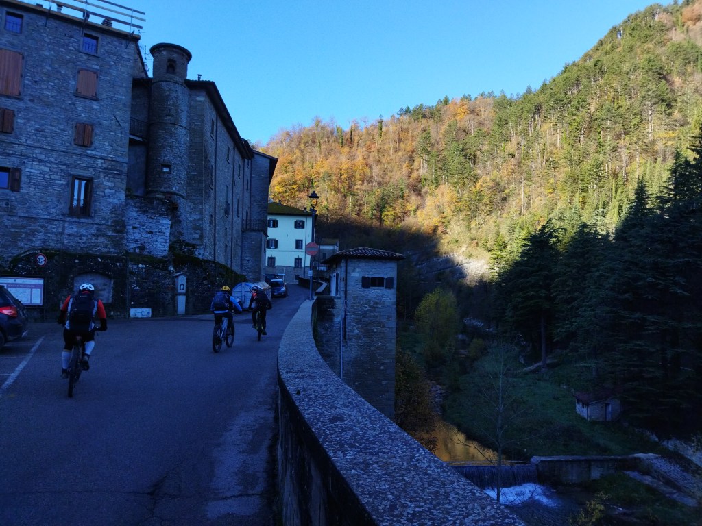 Ci sbrighiamo quindi a partire e subito dobbiamo correggere la traccia perché il ponte su cui passava il percorso non esiste più da alcuni anni. Si costeggia il torrente sulla destra orografica fino ad incontrare un vecchio ponte che sovrasta delle cascate (tutti luoghi debitamente segnalati sulla traccia di Davide come da non perdere). Si prosegue poi, sempre in ombra, per un bel tratto fino a che, passati sull’altra sponda e guadagnato l’asfalto, si vede finalmente il sole e ci si può togliere il giubbino felpato fino ad allora risultato indispensabile.
