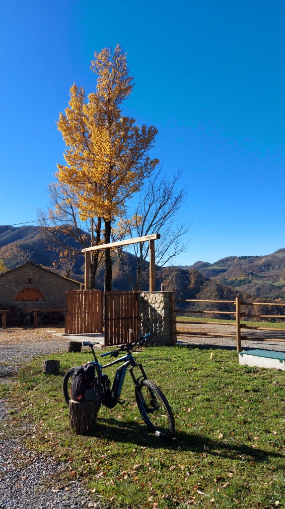 Tant’è, prendere o lasciare, mi decido ad aggregarmi alla compagnia anche se pieno di dubbi sulla mia “adeguatezza” per un giro descritto come impegnativo tecnicamente, pieno di gradini e gradoni, brecciolino e zone con terreno umido e scivoloso ed una seconda salita (già perché il programma non è solo il Monte Tiravento ma il doppio Tiravento) decisamente impegnativa per tirarsi dietro un mtb elettrica da 25 chili. Con l’aiuto del Due (alias Incerti Enrico) mi decido a cambiare gomme alla MTB sostituendo quelle ormai diventate delle slick con quelle acquistate da un po’ ma ancora parcheggiate sugli scaffali della cantina (decisione fondamentale).