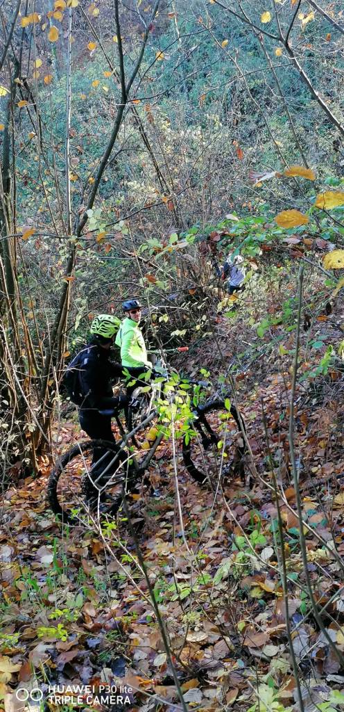Da qui il nostro giro prosegue verso l’oratorio di Beleo ma dopo una bella e lunga discesa ci troviamo il sentiero nel bosco bloccato da diversi alberi che ci impediscono il proseguimento nonostante manchino poche decine di metri all’uscita. Ma a questo punto ecco intervenire Gianluca (l’unico elettrico) che si fionda nel fitto bosco e riesce a trovarci un varco per uscire, evitandoci la lunga risalita a spinta!!.
