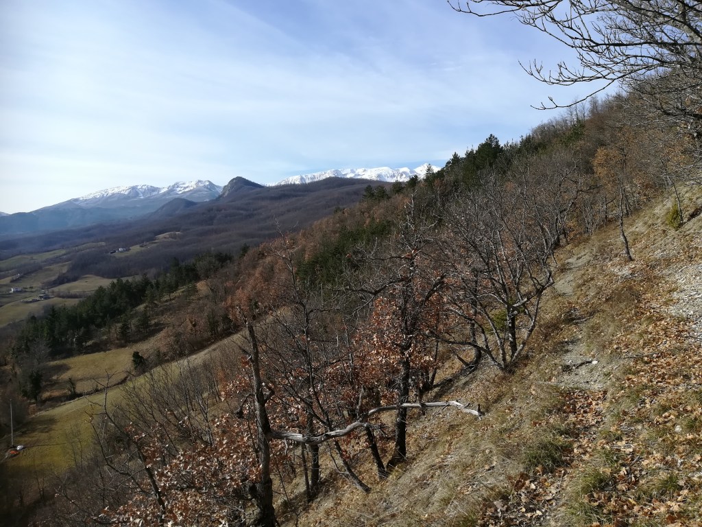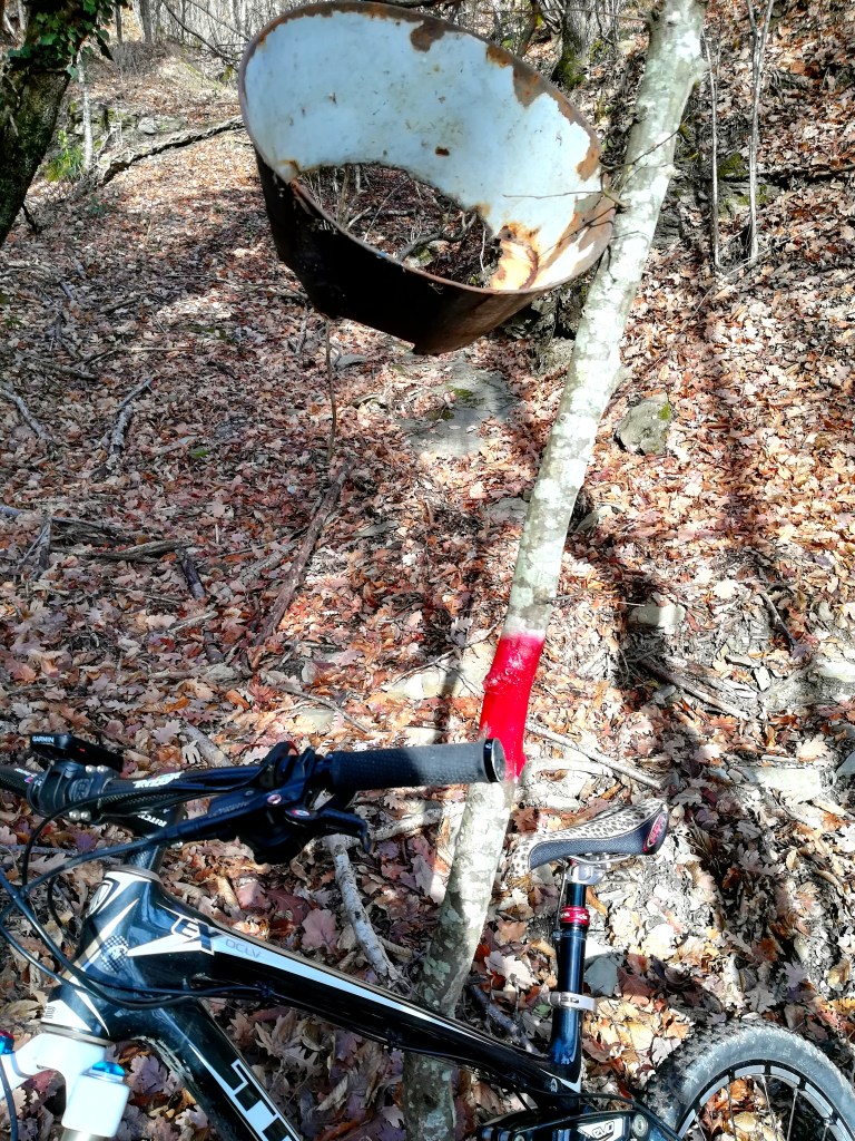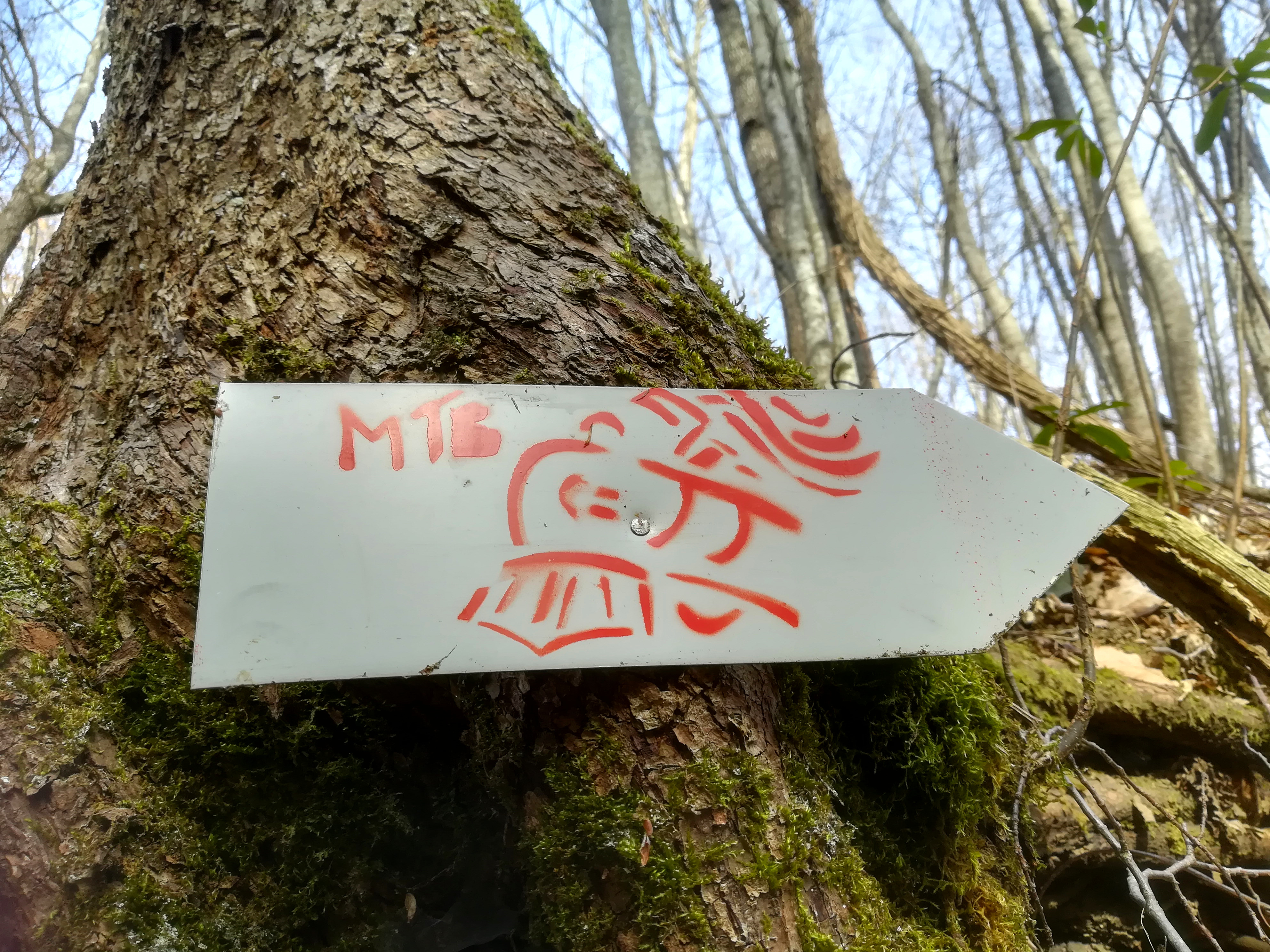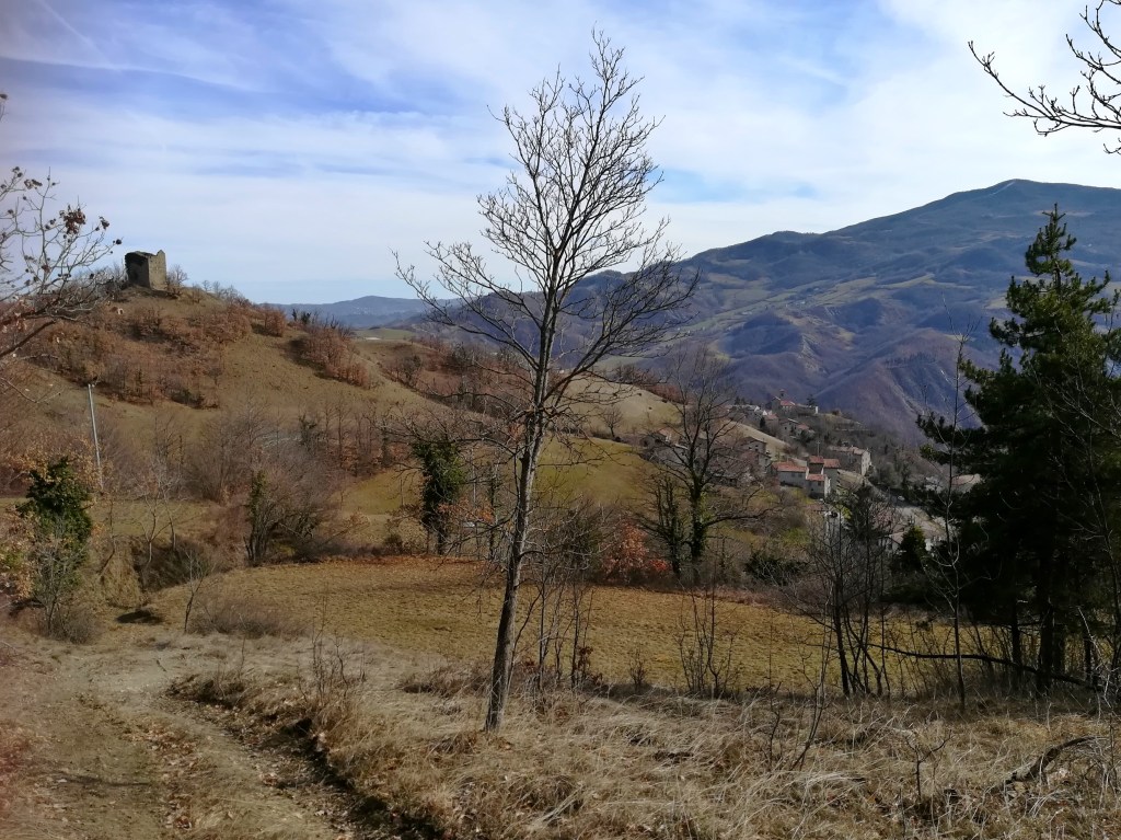 Domenica 13/2/2022 Sono passati diversi mesi da Settembre, la prima tappa della Transappenninica è tracciata, ma non mi sono dimenticato di quel cartello sbiadito e di quel sentierino dove cent’anni fà passava un treno con un percorso che con una pendenza inferiore al 3×100 si presenta come ideale per un tracciato di mtb. Così oggi, orfano del motore, ho ripreso a mano la vecchia bici muscolare deciso a soddisfare la mia curiosità . Da Quara raggiungo il bivio che ha destato la mia curiosità, quello con il cartello tra i rovi, segnale che tra l’altro ora è sparito ! Non mi lascio intimidire, oggi sono in versione “espoloratore”, vado avanti piano piano spostando i rami che ostruiscono il sentiero mettendoli a lato anche come uso di segnavia. Il tracciato seppure abbandonato c’è ancora e ogni tanto compare una tabella con il disegno del treno, con una vernice sprai comincio a fare dei bollini rossi sulle piante per incrementare la segnaletica. La pendenza è minima, l’unico problema è superare i tanti fossi che, in mancanza dei ponti di legno costruiti x il passaggio dei treni, costringono a brevi ma ripidi “strappi” da superare a piedi. Una frana e un fosso un pò più ripido mi costringono a perdere circa 100 metri di quota. Scendo a Casa dell’Onesta x poi risalire subito dopo alla Fattoria di Tobia dove però “perdo il treno”! Non trovo più le tracce, provabilmente la ferrovia è stata coperta dalla strada che collega Novellano a Pian del Monte.
