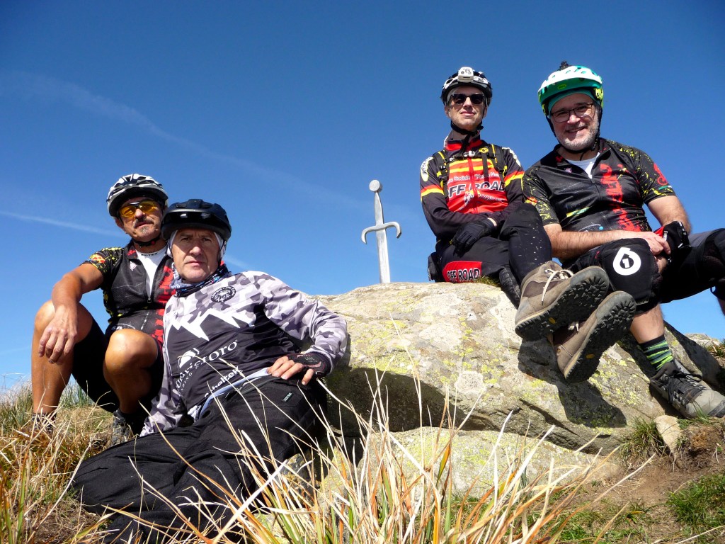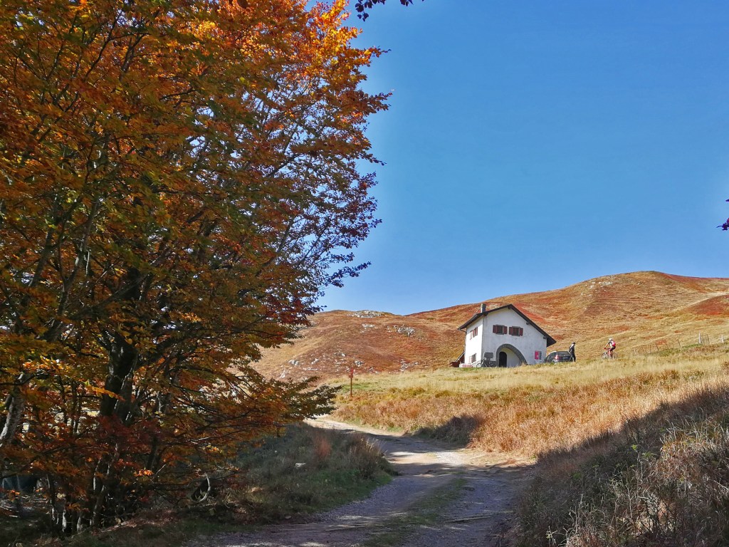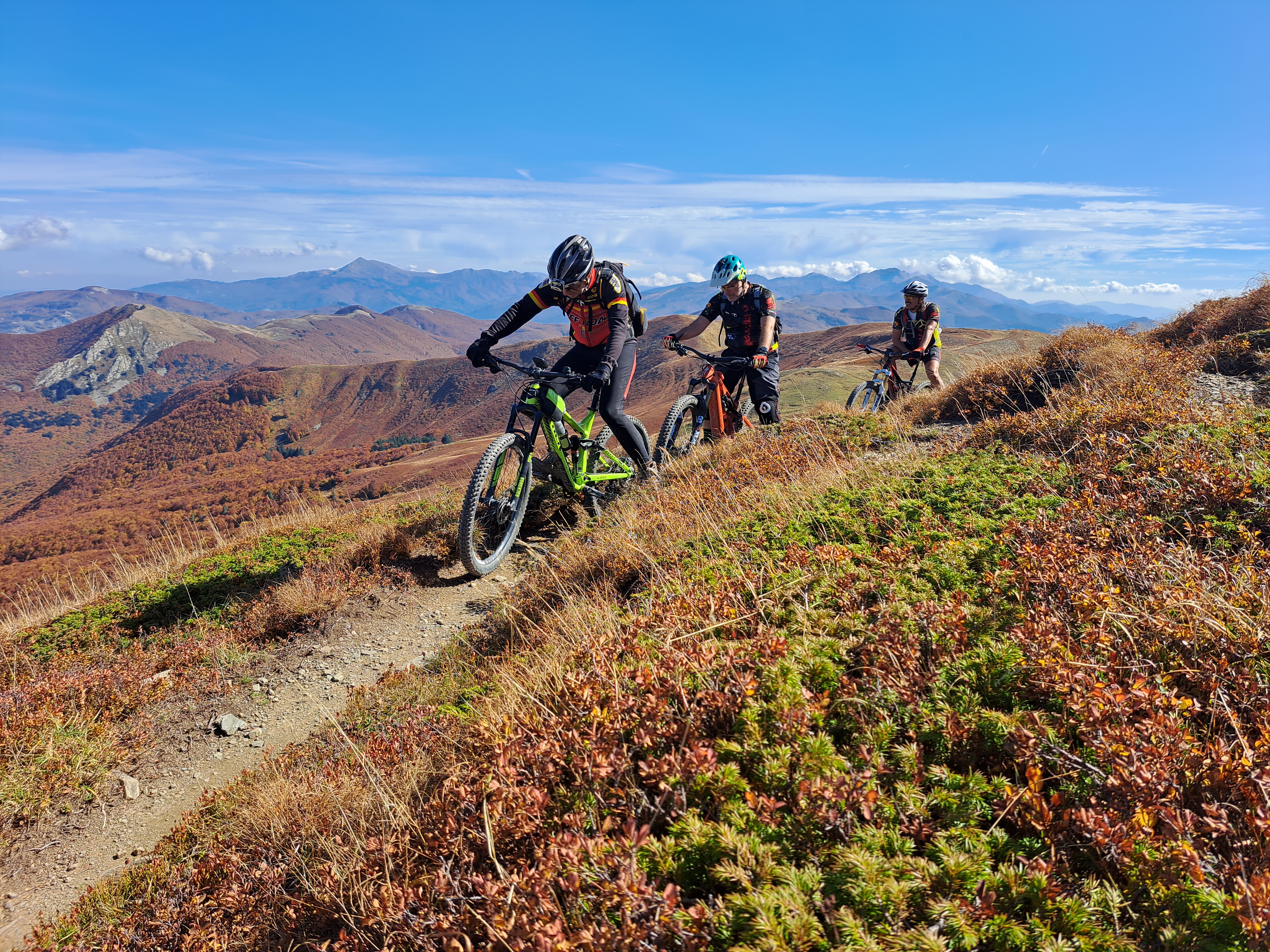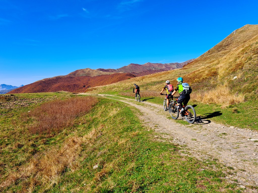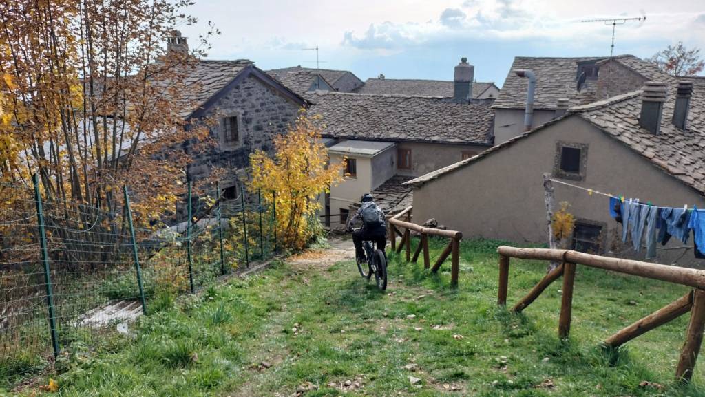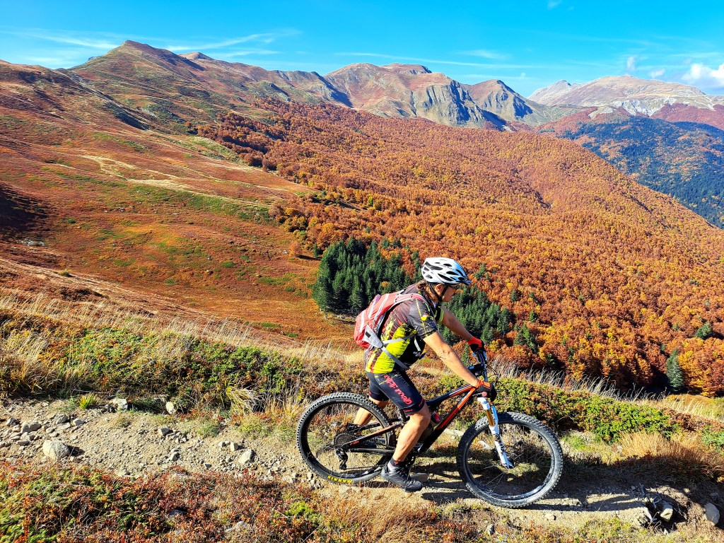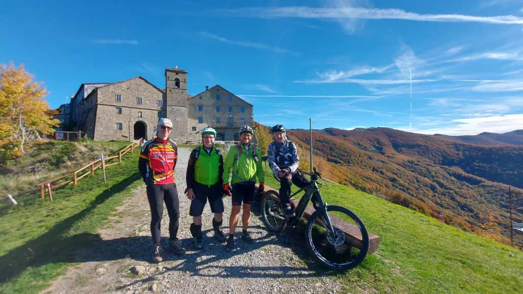 Il punto di partenza della nostra “avventura” è San Pellegrino in Alpe, un’antica borgata posta a 1525 metri sul livello del mare. La leggenda narra che il giovane Pellegrino, figlio del Re di Scozia, rinunciò alla corona, abbandono la patria e iniziò un lungo pellegrinaggio attraverso l’Europa raggiungendo la selva dell’Alpe. Quì insieme a Bianco, un eremita, offriva ospitalità ai viandanti che percorrevano le antiche vie Bibulca e Vandelli. Il confine fra la regione Emilia e la Toscana taglia longitudinalmente il paese e nel santuario i Santi, Pellegrino e Bianco, posti nell’urna dietro l’altare riposano con il capo e il busto in Emilia e con il resto del corpo in Toscana. Anche la vecchia osteria del Duca d’Este (ora albergo L’ Appennino da Pacetto) risalente al 1221 e da sempre gestito dalla famiglia Lunardi è diviso in due : una parte sotto il comune di Frassinoro (MO) e una sotto quello del comune di Castiglione Garfagnana (Lucca). Così anche noi oggi abbiamo ordinato il caffè in Toscana e poi lo abbiamo bevuto, ancora caldo, in Emilia ! Siamo in quattro : Claudio e Stefano su e-bike, Davide e Paolo con la bici muscolare. Un piccolo gruppo dove ci accomuna il fatto di essere tutti un pò acciaccati ma comunque determinati a raggiungere l’obbiettivo ! La partenza è subito fuori strada, un sentiero marcato cai, saliscendi e qualche ripido strappo, ci porta a superare il Passo delle Radici poi aggirando l’Alpicella delle Radici cominciamo a salire verso il Passo Giovarello….. (Davide >) All’improvviso scorgiamo il Rifugio Maccherie, ancora incorniciato dalle fronde degli alberi che costeggiano la forestale, che si staglia netto sullo sfondo irreale giallo-rosso autunnale delle caduche foglie dei faggi delle pendici del monte Giovarello ed è circondato da una verde radura d’incanto. Dev’esser fantastico soggiornare una o due notti qui, ma nessuno di noi lo ha mai visto aperto. Con gran sorpresa vediamo invece dei ragazzi che entrano ed escono come formiche, sistemano oggetti e vivande e sono straripanti di felicità. Ne hanno da vendere, di felicità, tanto che entriamo subito in sintonia con loro e ci parlano del loro gruppo, il Team Ciukkè di Carpi. Ci mostrano con orgoglio le maglie che indossano e, con un pizzico di autoironica vanità, picchiettano la testa con l’indice della mano destra, strizzano l’occhio e sorridono. Ci dicono come hanno scoperto il rifugio, di come fare per avere le chiavi e ci fanno cortesemente entrare per visitarlo. Sono appena arrivati, si stanno pregustando un weekend da favola, sono carichi come delle molle! Poi usciamo, per ultimo Paolino che chiude la porta (clack) e salutiamo colmi di gratitudine per tanta gentilezza, non consueta in questi tempi. Partiamo tutti, tranne Stefano che, come il solito tarda un pò. Questa volta però questo piccolo ritardo gli è costato abbastanza caro, forse la vita stessa, ci spiegherà trafelato poi. Difatti quando arriva è abbastanza agitato ed un pò malconcio…e ci spiega che la porta delle Maccherie non ha una maniglia estrerna, e quando paolino ha chiuso la porta (clack!) con le chiavi dentro di fatto ha chiuso fuori tutti gli otto ragazzi ospiti del rifugio, i quali si sono visti sfumare, con un semplice clack, l’intero weekend! Non so cosa abbiano detto o fatto a Stefano in quei dieci minuti che è rimasto in loro balìa e, forse, non lo sapremo mai. Una cosa è certa: al ritorno non ripasseremo dalle Maccherie !! (Claudio >) Dal rifugio Maccherie continiuamo a pedalare seguendo la forestale , superiamo il Passo Giovarello (q.1660), il Passo delle Forbici (q.1575) e raggiungiamo il Rifugio Cella (q.1650), piccola costruzione in pietra uguale al precedente rifugio; affacciatomi sull’atrio vedo che all’interno ci sono persone e, sul tavolo, diverse bottiglie. Quello che manca però è la porta e allora …allora possiamo proseguire! Siamo un pò in ritardo sulla tabella di marcia, abbiamo “perso tempo” e scattato tante foto ammaliati dai panorami e dai colori autunnali ma sappiamo anche che.. il meglio deve ancora venire ! Ora ci aspetta la parte più difficile della giornata ; un ripido sentiero sale a Bocca di Massa (q.1818) in un chilometrino guadagnamo più di 160 metri di dislivello. Anche con la bici elettrica non è stata una passeggiata, a tratti mi sembrava di cavalcare un toro meccanico. A Bocca di Massa siamo sul crinale appenninico e sul sentiero 00, con una piccola deviazione da questo sentiero con un ultimo strappo eccoci sul Monte Cella (q1942) davanti a noi, piantata nella roccia, una lucida spada! La leggenda della spada nella roccia, tramandata attraverso i secoli e raccontata in libri e pellicole, si lega a due personaggi altrettanto leggendari : Re Artù e Mago Merlino. La storia narra di Artù che, allevato da Merlino, divenne Re d’Inghilterra dopo essere riuscito a estrarre dalla roccia Excalibur. Sicuramente questa non è la spada magica, siamo sul crinale dell’appennino Tosco-Emiliano; ben lontani da Camelot ! In Italia si trovano almeno altre 5 spade nascoste tra le Alpi e gli Appennini, tutte legate al mito di Re Artù o forse no.. Ma la magia di sentirsi per un istante il giovane Semola (futuro Rè Artù) è assicurata di fronte a questa misteriosa spada ! Consumata una “panoramica” merenda e dopo aver scattato un’infinità di foto riprendiamo la nostra escursione e seguendo il sentiero 00 ritorniamo al Passo delle forbici e poi al passo Giovarello. (Davide >) Al Passo Giovarello (q.1660)la compagnia si divide : Stefano e Davide decidono di salire in vetta al monte, Claudio e Paolino, dovendo rientrare presto, rimandano la salita ad un’altra occasione. Purtroppo la salita è a spinta, ma si intuisce subito che vale assolutamente la pena faticare un po’ per quei cento metri di dislivello : il crinale per la cima è bellissimo,panoramicissimo. Arrivati in vetta (q.1760), poi, la visuale è a 360 gradi sulla Val Dolo, s
