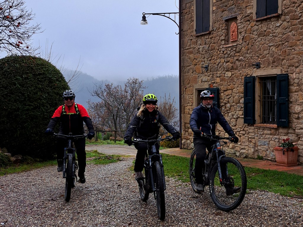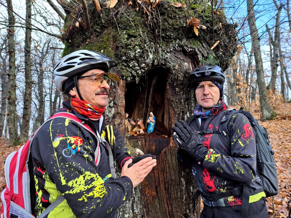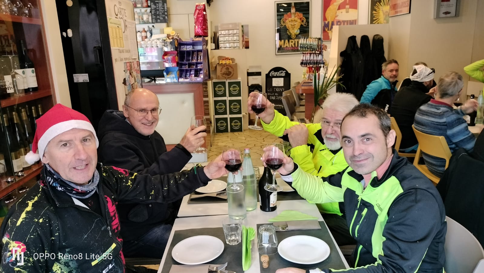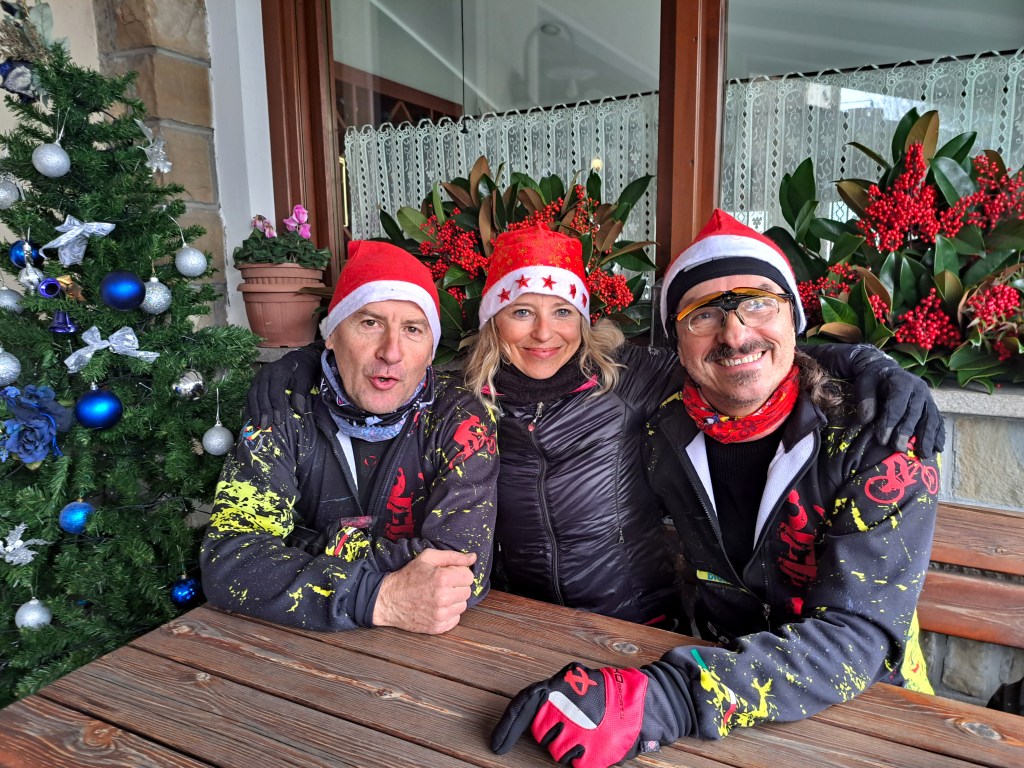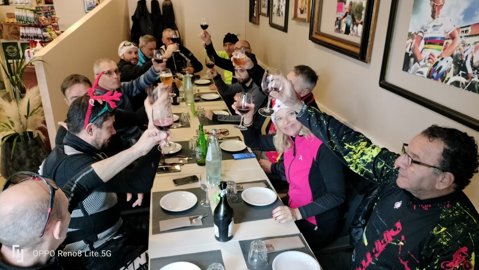 Viste le condizioni meteo dei giorni precedenti questa uscita, seppur breve, è stata apprezzata. Con un percorso ad anello tra i boschi di Casina e Marola siamo riusciti a girare in fuori strada senza impantanarsi, galleggiando sopra le foglie di castagno. A fine escursione lo scambio degli auguri e i brindisi si è svolto al bar Centrale di Casina dove Cristian ci ha coccolato con la sua specialità (l’erbazzone) e tante altre cose buone. Quello che doveva essere uno spuntino è diventato praticamente un pranzo…. Diversi i brindisi e calorosi i cori di auguri x tutto il gruppo Off Road con la certezza che anche il prossimo anno ci sarà da pedalare !!