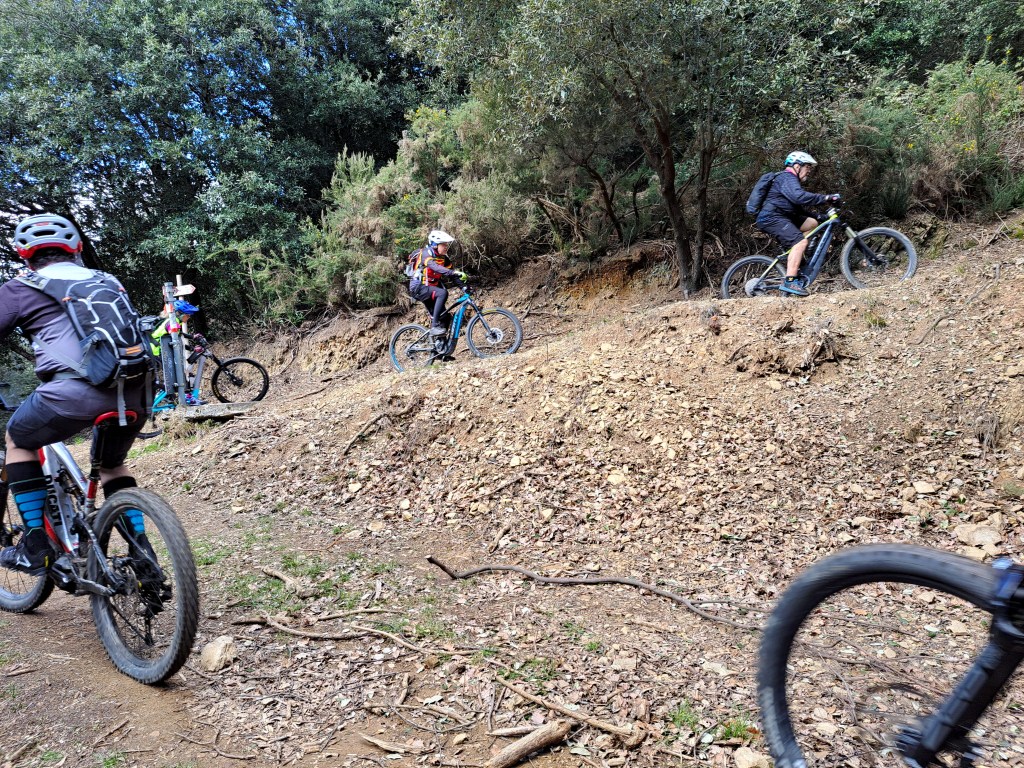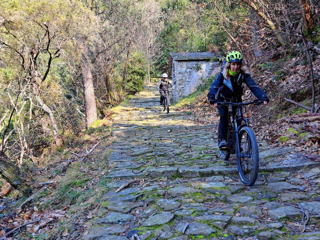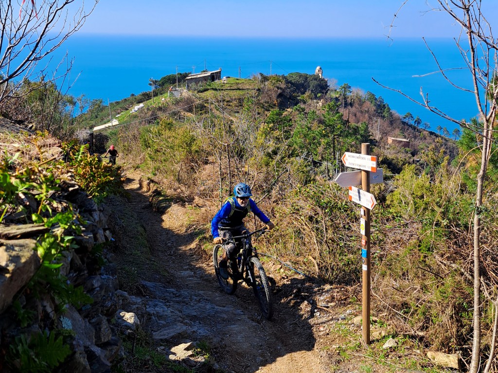 Dal bivio di Bramapane prendiamo il sentiero marcato Alta Via delle Cinque Terre, un tratto impegnativo che tenendosi in quota sopra il mare permette di attraversare in fuoristrada la dorsale che sovrasta il litorale ligure. Pedaliamo su superfici che si alternano tra radici, rocce e terra, single-trak che tagliano le montagne,brevi “strappi” ripidi , continui sali-scendi. In alcuni tratti il “portage” è obbligatorio. Pur rimanendo nel bosco, il percorso, ogni tanto regala panorami sia sul mare che sulla dorsale Appenninica.